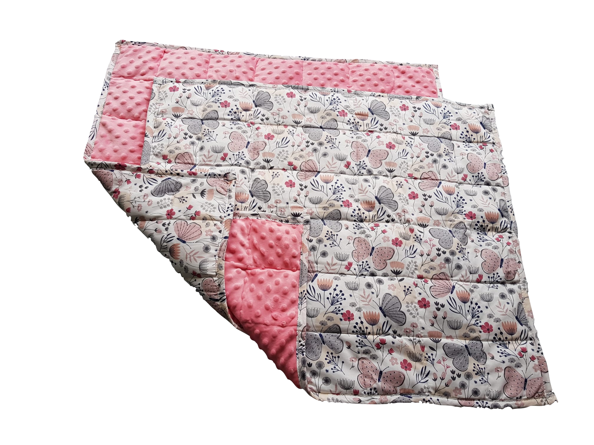 These blankets come with a vibrant printed butterfly cotton fabric on one side and a pink minky-dot fabric on the other.